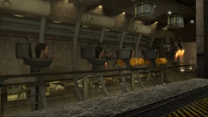 With the release of Episode 69 Part 1 there is a look at the experimental room, where several toilets are jailed for experimental and preserving reasons. Rooms of huge sizes are seen, which are junctions for other experimental rooms. Continuing on the path there is a look to a gray hallway, leading to a large storage room where G-Toilet and other Toilets were located, with an elevator to the side, as shown in the full episode of Episode 69.