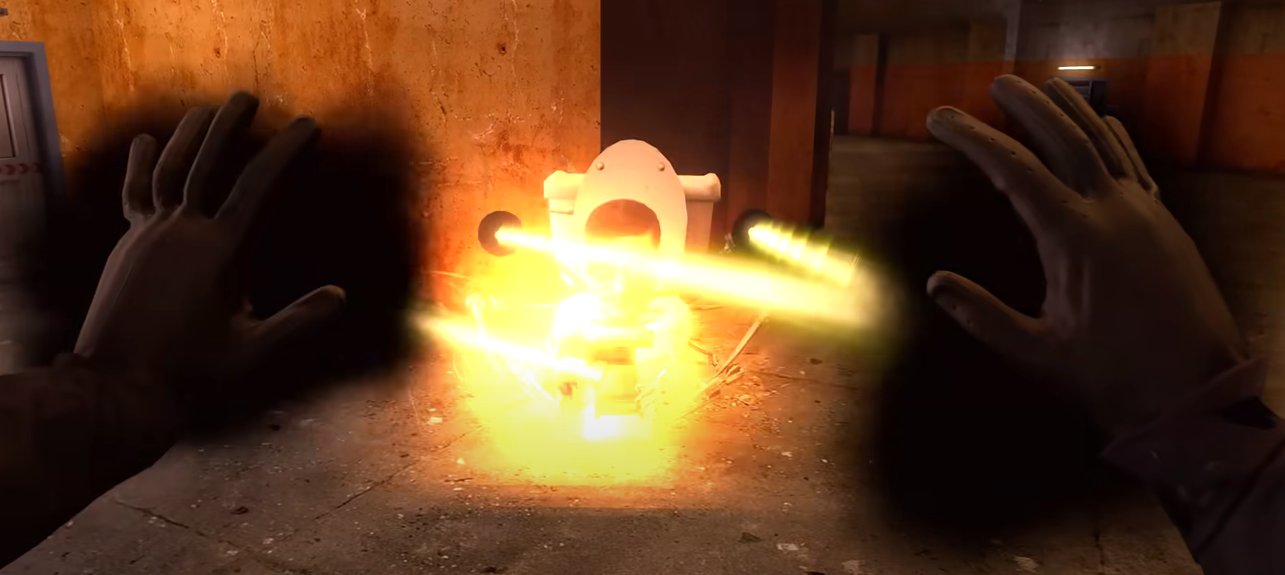 The Dark TV Man using his Attack Deflection ability to return the attack to the Scientist Laser Skibidi Toilet.