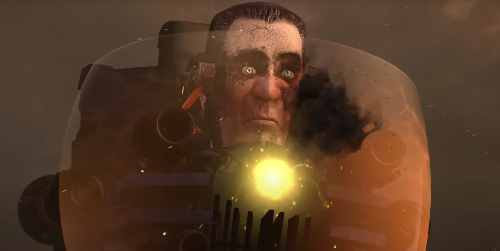 G-Toilet, lost various weapons and equipments after being smashed by a mechanical hammer blow from Titan Cameraman in Skibidi toilet 57. Looking at his appearance, it can be seen that his face was burned and shattered as a result of Titan Cameraman's core flame ability, his headphones and yellow glasses were completely destroyed, back plate and one left side plate was broken, the others were scattered as a result of the impact, and he lost two of his laser cannons. Apart from these, the jetpack turbines and remaining laser cannons are fully functional and working.