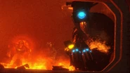 The Hunter Astro Mutant burning while being crushed by the Executioner Speakerman's firm grip.