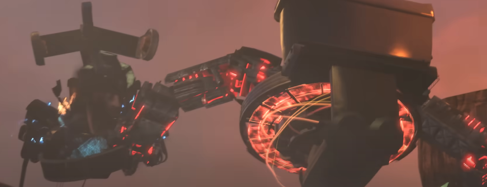 The Juggernaut Astro Toilet about to teleport away from the area with the Detainer Astro Toilet via Warping to save the latter's life.