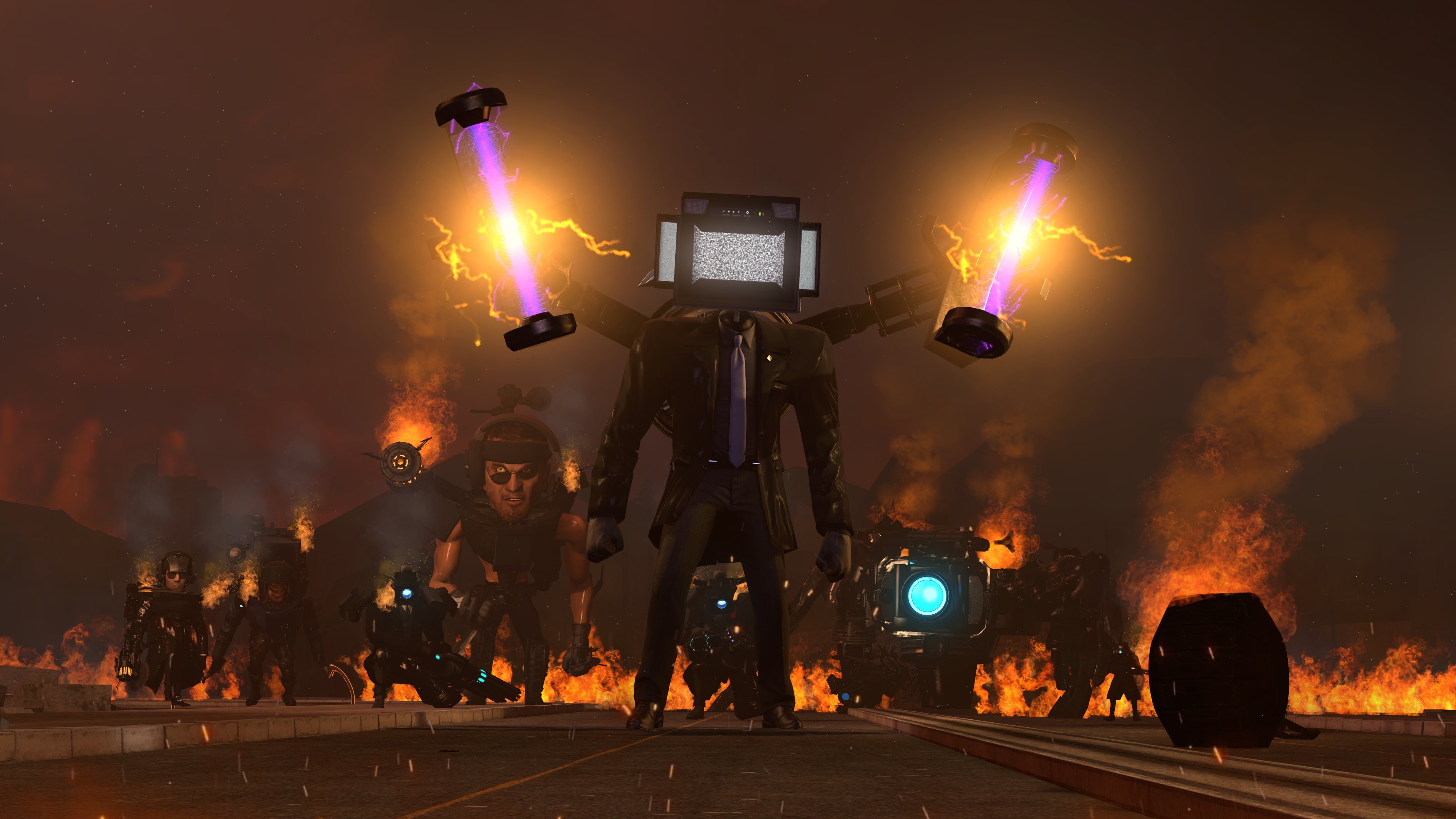 The SWAT Skibidi Mutant about to use two of his Rocket launchers against the Camera mech from a distance.