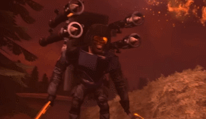 In his appearance in Episode 77, he showed up with a few upgrades, now wielding two Energy sickles as melee weapons, which he wields with deadly efficiency, being able to precisely throw them, decapitating multiple targets at once. He also regained his side-mounted Rocket launchers and recovered his SWAT helmet (now additionally integrated with a yellow tinted visor).