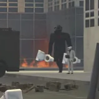 The Scientist Cameraman 1337, before he kill the Injured SWAT Skibidi Mutant with his own Sickle, G-Toilet arrived in the battlefield, destroying everything using his Laser cannons. Due to his large size, he was able to easily destroy everything. The Scientist's Mech ended up exploding due to multiple damages, but the Cameraman survived by abandoning his mech. He then limited himself to observing as the Detainer Astro Toilet challenged G-Toilet 4.0.