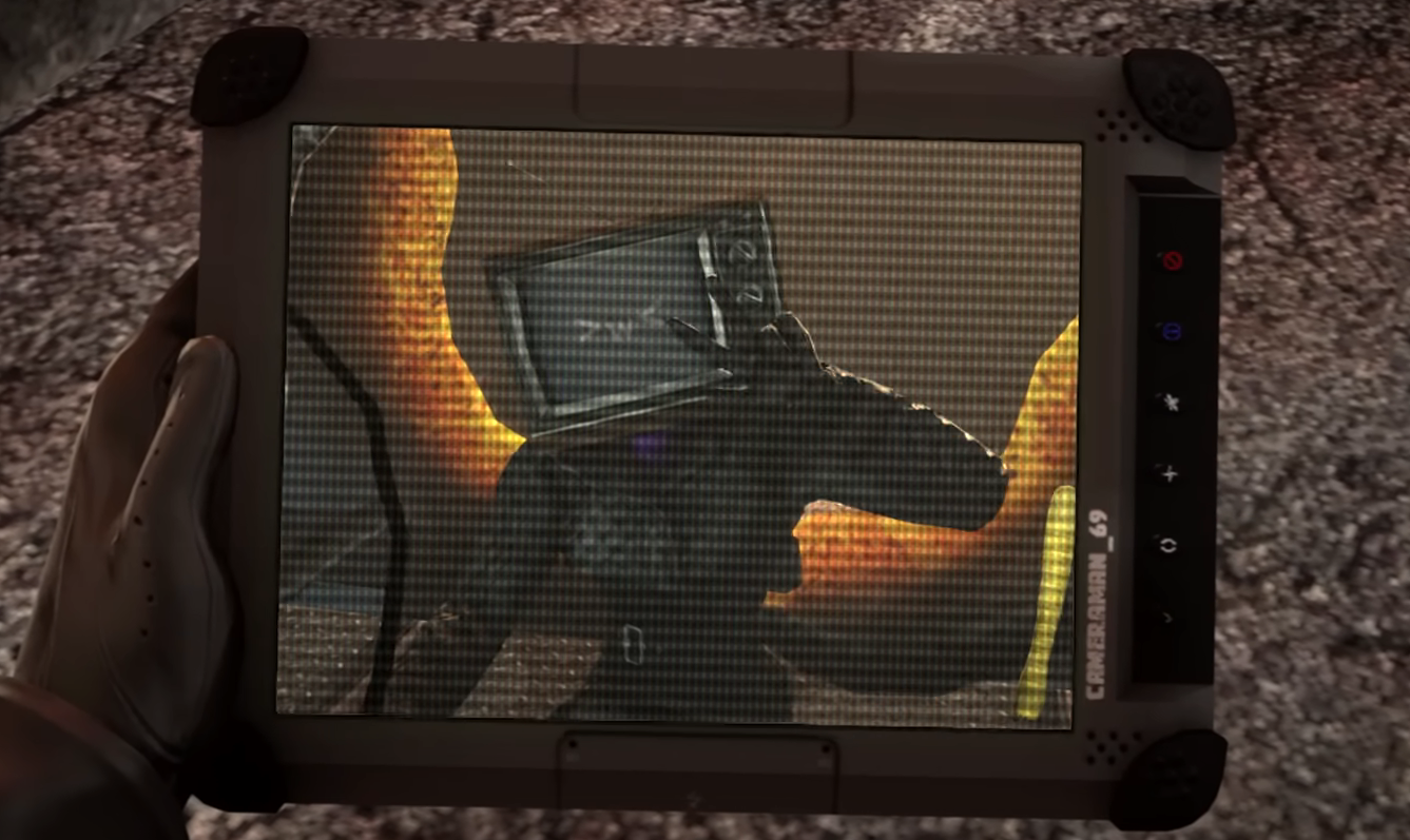 The Scientist Cameraman 1337 gestures his head for the CH4D Cameraman to return to his chamber, TV Woman silently observes the CH4D Cameraman before being pushed away for the CH4D Cameraman to return to his chamber. TV Woman sadly looked at the ground, feeling horrible after being pushed, and she stayed alert at the intruder alarm of the entire Headquarters.Feats[]