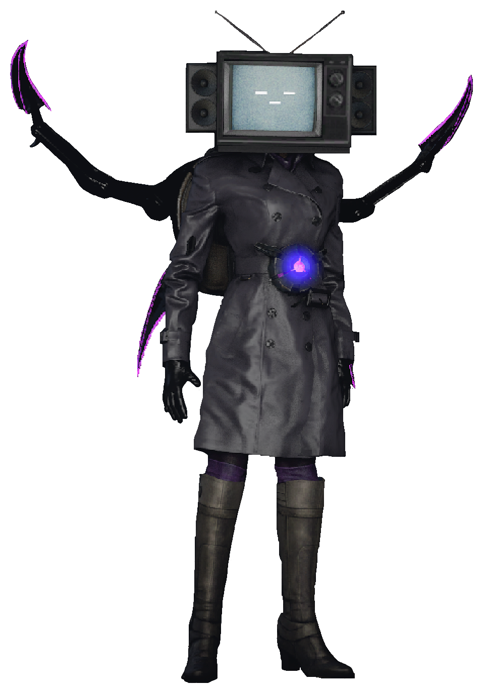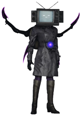 TV Woman shares a similar appearance with the Normal TV Man. She is dressed in a black leather coat with a purple turtleneck underneath, black boots, and black leggings, plus, her black boots have a purple hue on top of it. Her TV Head stands out with a unique design, resembling a vintage TV from the late 1960s to the early 1980s.